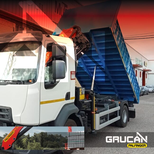 Montaje grúa Palfinger modelo PK 10002 SH + Fabricación carrocería basculante con puerta trasera de libro fabricada por GRUCAN, Marca: RENAULT. Cliente: Lureyes